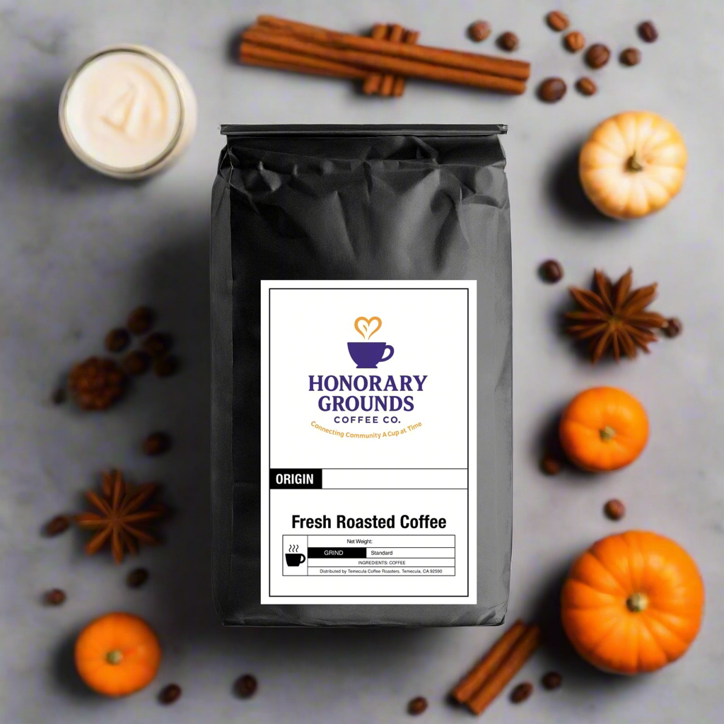 This seasonal favorite is available year round. The all natural flavoring has hints of pumpkin, cinnamon and nutmeg combined with a deep medium roast arabica coffee.
